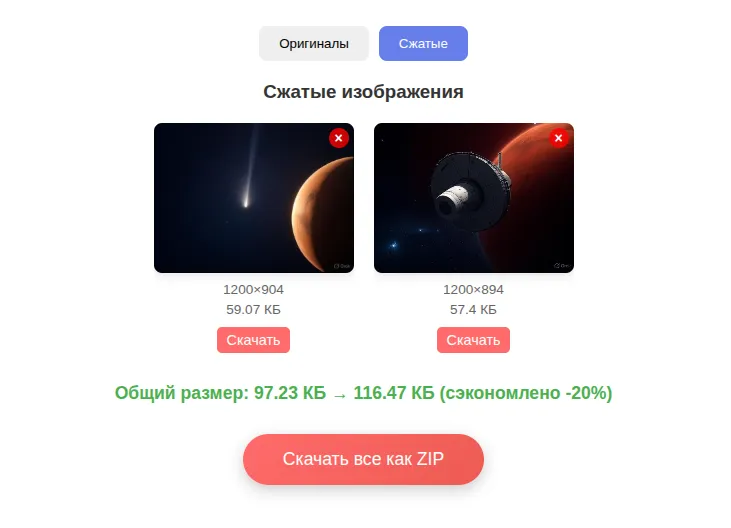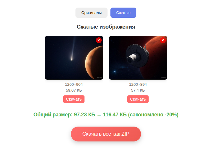 Этот онлайн инструмент позволяет сжимать (уменьшать размер в пикселях и килобайтах) фотографии или другие изображения. Он позволяет сжимать пакетно - сразу много изображений за раз, но можно использовать и для обработки одного изображения.
