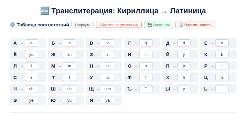 Если планируете часто использовать этот инструмент, можете сохранить своб табицу соответствий, чтобы не редактировать в следующий раз. Она будет сохранена только в вашем браузере в котором вы открыли страницу сейчас.