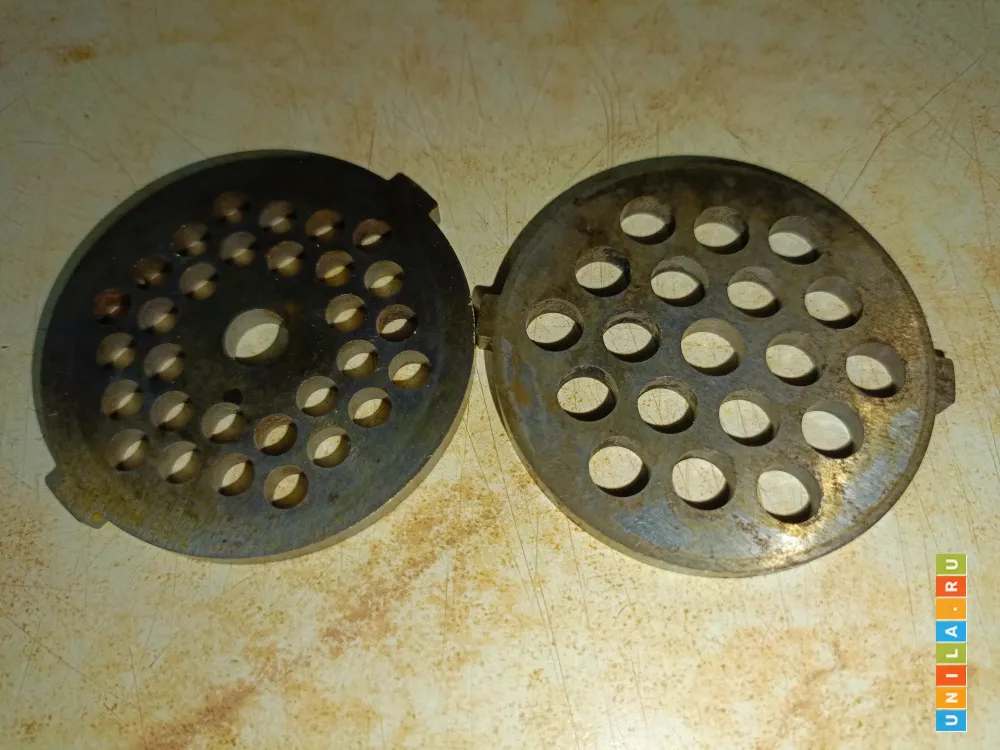 Я решил всё же попробовать. У нас к мясорубке имеется две решётки, у одной диаметр отверстий меньше, у второй больше. Я выбрал решётку с крупными отверстиями, на фото она справа. И могу сказать, что через мясорубку давить вино можно. С крупной решёткой косточки проходят целыми, почти не повреждёнными. Так что вряд-ли они испортят вкус вина. А мякоть давится хорошо, сок прямо льётся в чашку. Эффективный способ.
