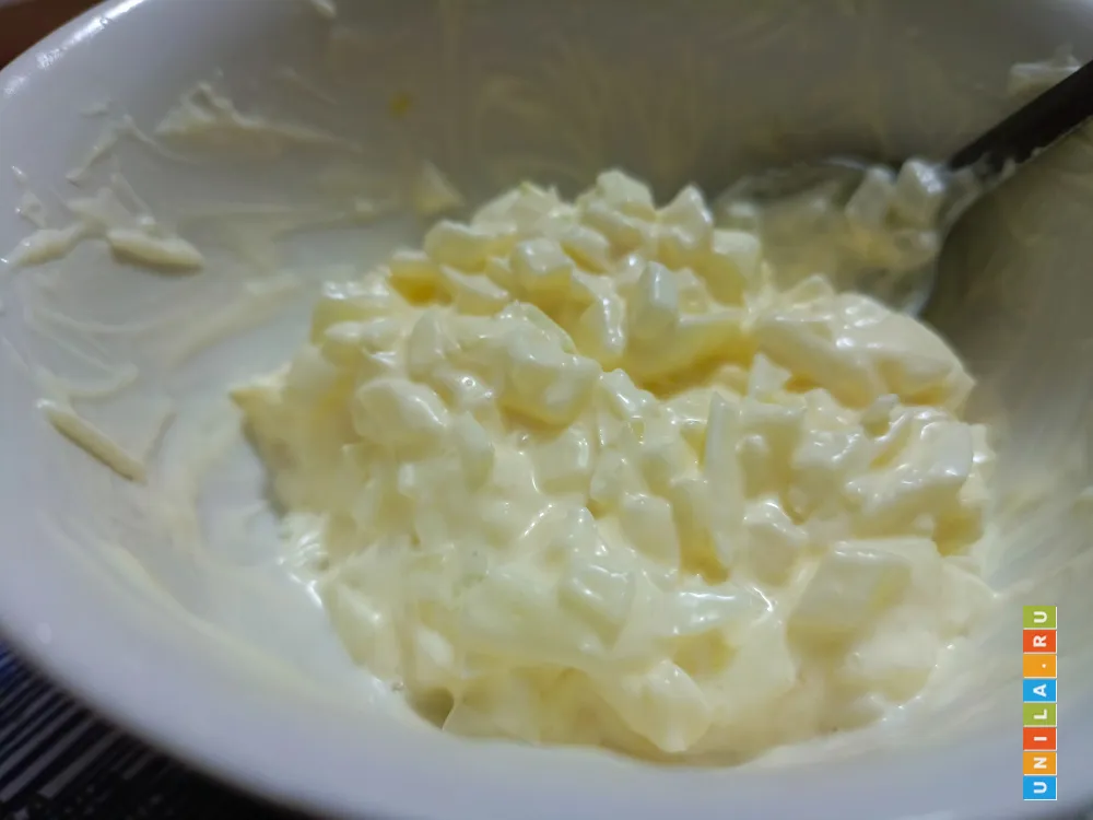 Добавил щепотку соли и две чайные ложки майонеза. Перемешал.