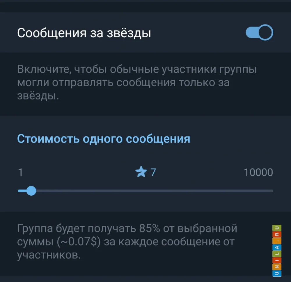 Также администраторы чатов (групп) в ТГ теперь могут назначать стоимость сообщений для участников чата. Для этого нужно из аккаунта администратора группы открыть «настройки группы» - «разрешения» - «сообщения за звёзды».