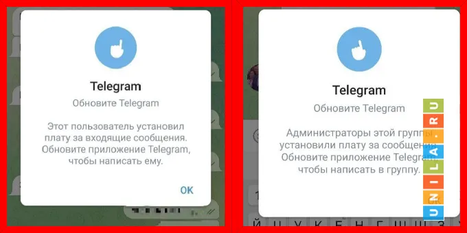 При попытке отправить сообщение в платный чат, пользователь увидит информацию об оплате. Если у него старая версия приложения, в которой ещё нет функции платных сообщений, ему будет предложено сначала обновить приложение.