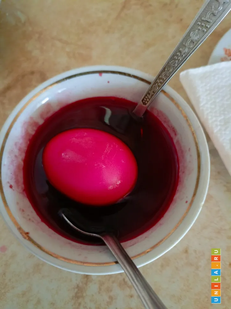 Процесс окрашивания яиц. Среду после варки яйцо окунаю в чашу с краской.