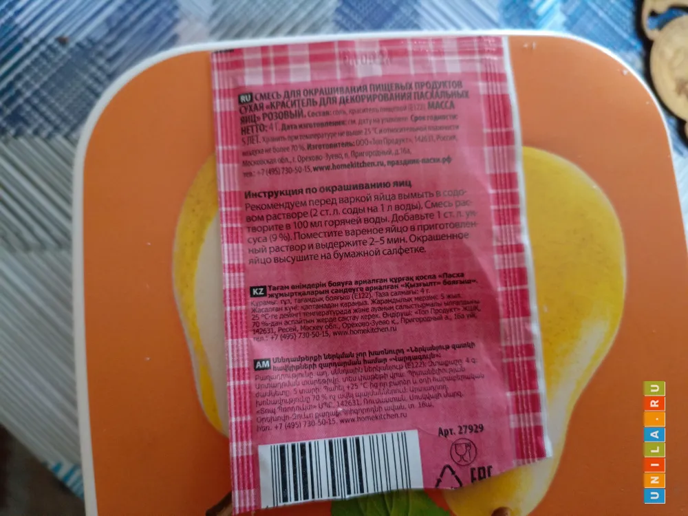 Оборотная сторона упаковки от пищевого красителя для яиц. Инструкция по применению