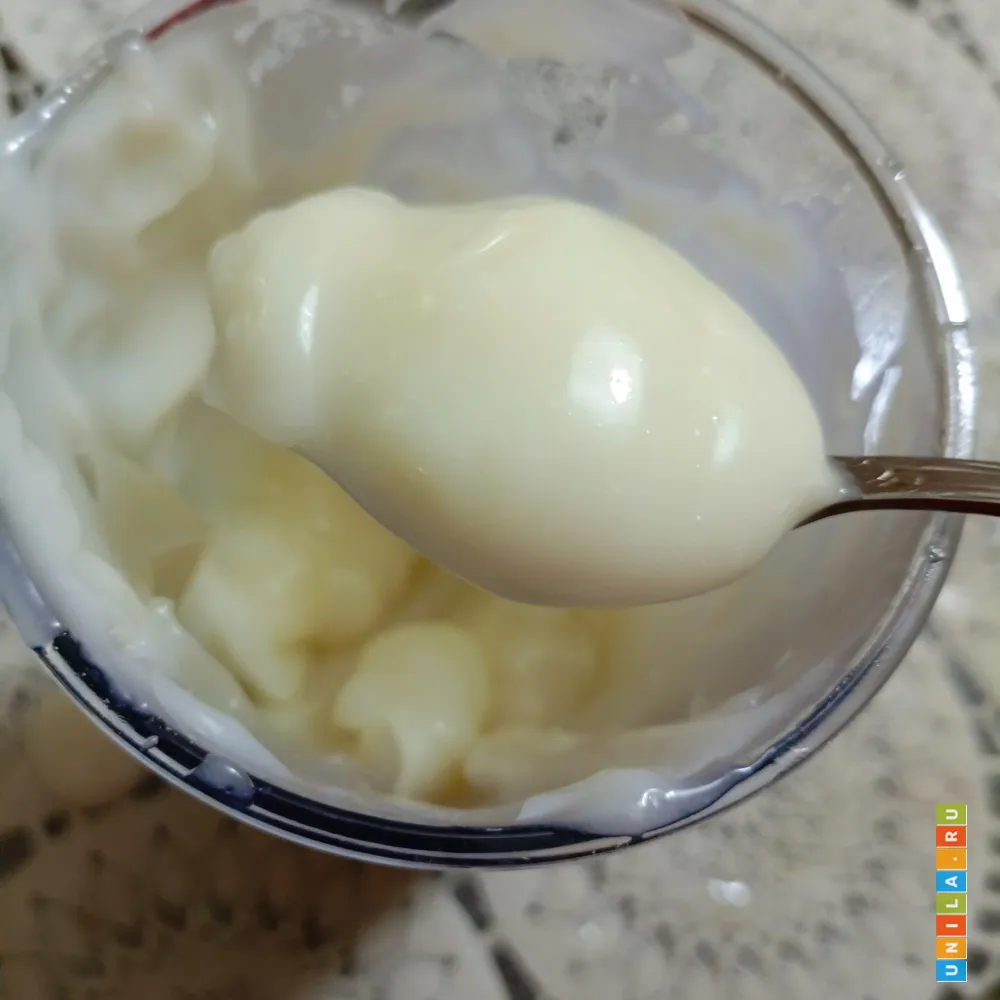 Тогда я добавил ещё полчашки масла. По опыту с майонезом на молоке я помню, что там пропорции молока и масла вообще 2 к 1 в пользу масла.
