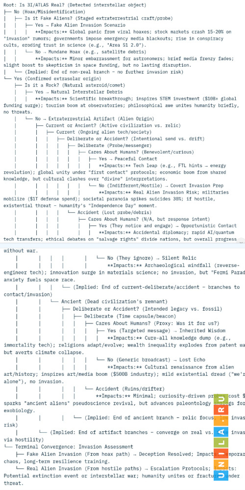└─ Реальное вторжение пришельцев (Из враждебных путей) → Протоколы эскалации; Последствия: Потенциальное событие вымирания или межзвёздная война; человечество объединяется или распадается под угрозой.