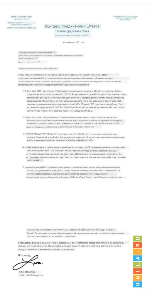 И вчера, 31.10. конгрессвумен Анна Луна опубликовала письмо к руководству НАСА в котором запросила данные по Атласу. Просит раскрыть сведения и изображения полученные в результате наблюдений за последние месяцы. И запросила снимки полученные во время сближения кометы с Марсом.