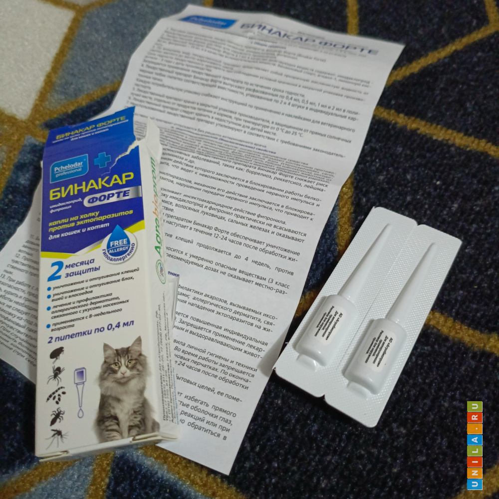 И кошка не чешется вообще! Похоже, что средство работает. Не знаю надолго ли. Судя по описанию, одна пипетка - на месяц. Но думаю, зимой можно использовать меньше, так как меньше возможностей подцепить насекомых, только в контакте с другими животными.