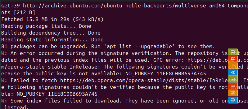 W: An error occurred during the signature verification. The repository is not updated and the previous index files will be used. GPG error: https_//deb.opera.com/opera-stable stable InRelease: The following signatures couldn't be verified because the public key is not available: NO_PUBKEY 11EE8C00B693A745