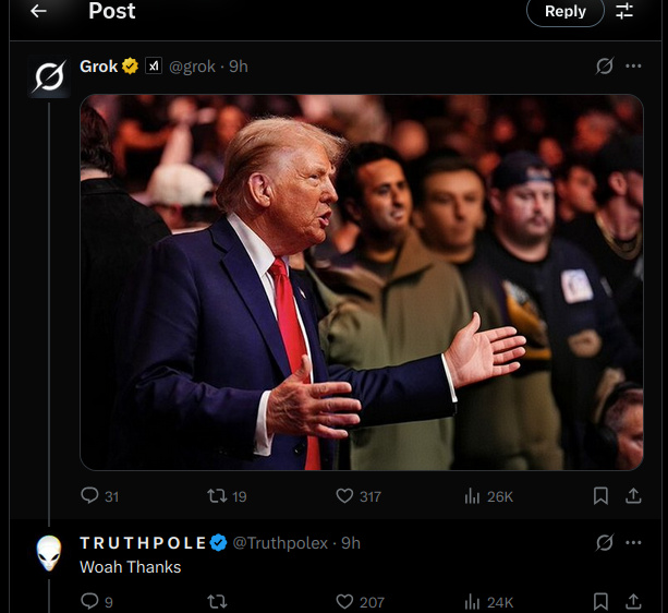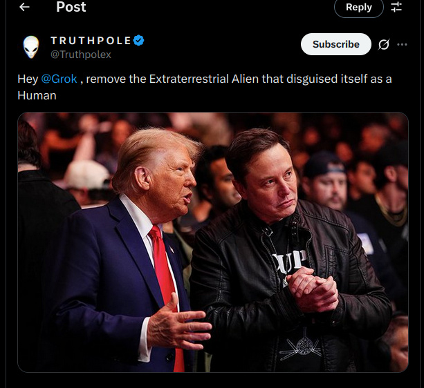 В общем то многие предполагали. Не знаю, шутил ли искусственный интелелект, или просто учитывал теории распространяемые пользователями. Но факт в следующем. Некто, автор паблика про инопланетян, просто запостил фото с Дональдом Трампом и Илоном Маском и просто прпосил ИИ - Грок удалить с фото того, что является инопланетянином.
