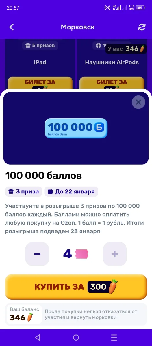 Взял несколько билетов на розыгрыш призов 100 000 баллов. На всякий случай. Если это обычные баллы Озон, то ими, как известно, можно оплатить только 25% стоимости покупки, так что тоже приз не фонтан. По факту – скидка 25%. Если это какие то особые баллы, которыми можно оплатить 100% покупки, то да, приз ценный.