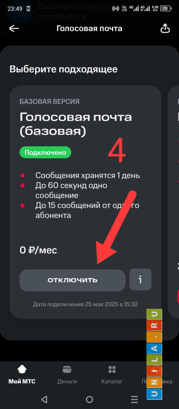 Здесь показано пошагово на скриншотах – как выключить голосовую почту или включить её в приложении МТС. В моём случае подключена бесплатная версия голосовой почты и я буду её выключать.