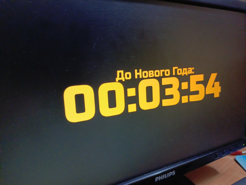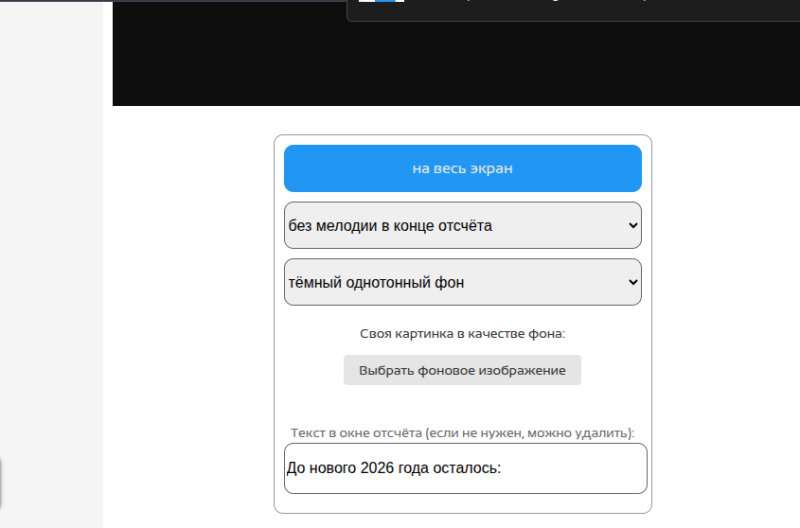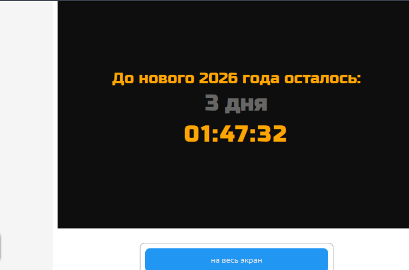 Теперь нажмите кнопку «на весь экран». Назависимо от того, какой фон вы выбрали, за 1 минуту до нового года фон станет красным. Если вы выбрали опцию со звуком в момент наступления нового года зазвучит мелодия. В момент наступления нового года вместо часов на экране появится сообщение о том что новый год наступил