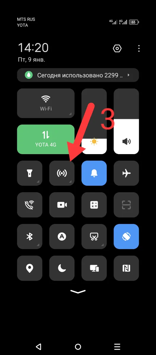 Если у вас сверху выдвигается шторка, но там нет кнопки с точкой доступа нажмите сначала по красной стрелке, потом по синей стрелке