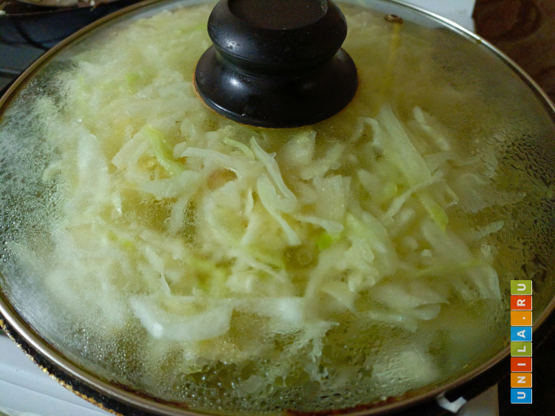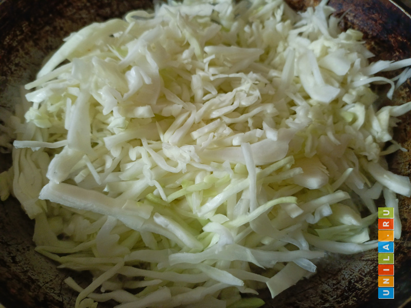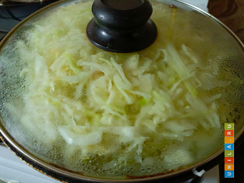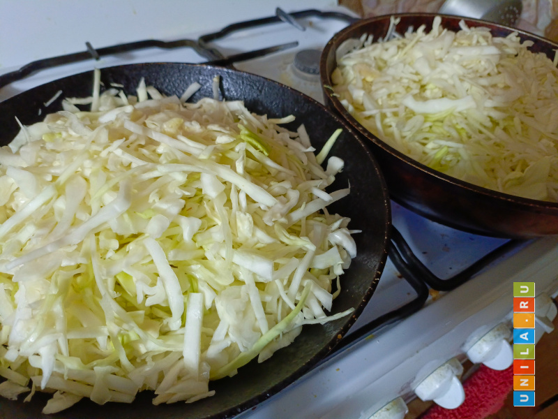 Если вся капуста не помещается, будем докладывать её в сковороду по мере того, как она будет оседать. Или разделим на две сковороды и потом соединим