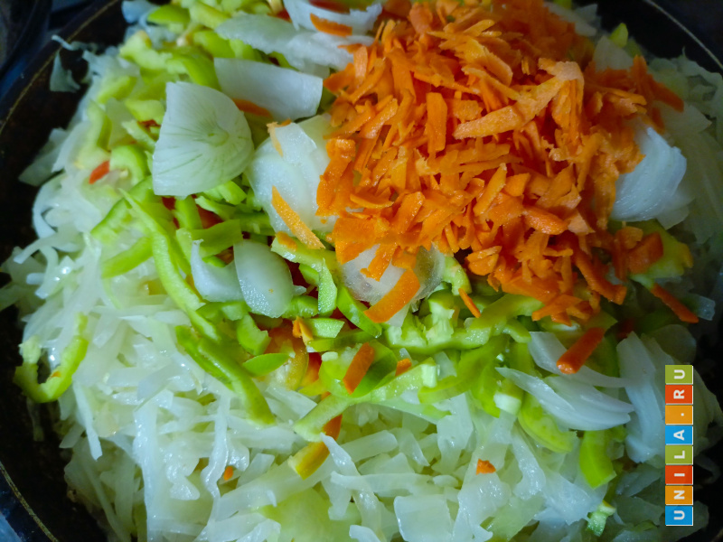 В казане или большой сковороде нагреваем растительное масло 100 гр на 1 кг капусты и выкладываем капусту