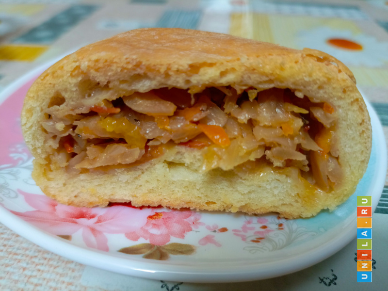 Демонстрация в разрезе пирожка с капустой приготовленного в духовке на основе этого теста