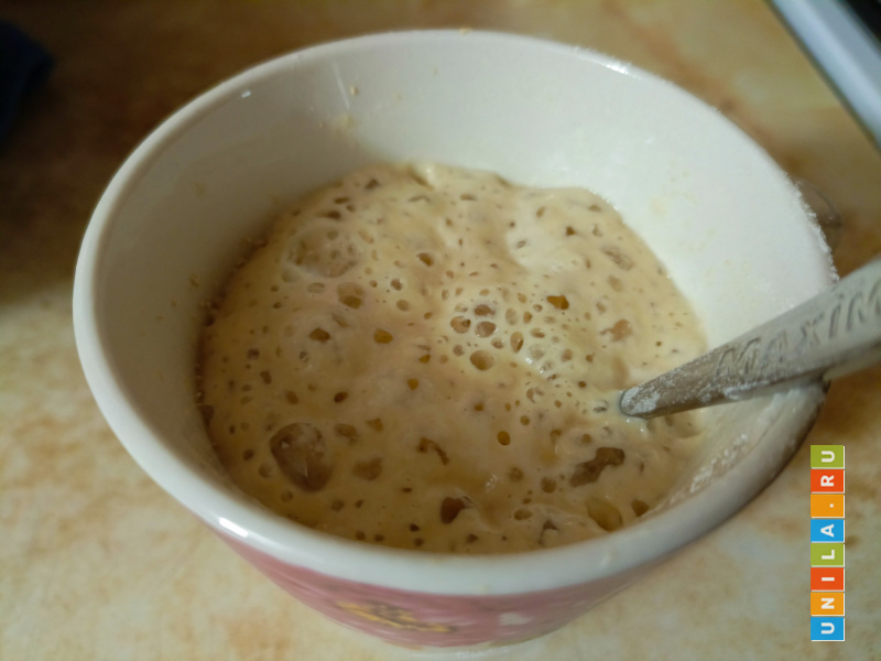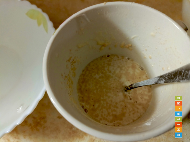 Сначала разведите дрожжи. В чашке смешайте 100 грамм чуть тёплой воды, полторы чайной ложки сухих дрожжей, чайную ложку сахара и две чайных ложки муки