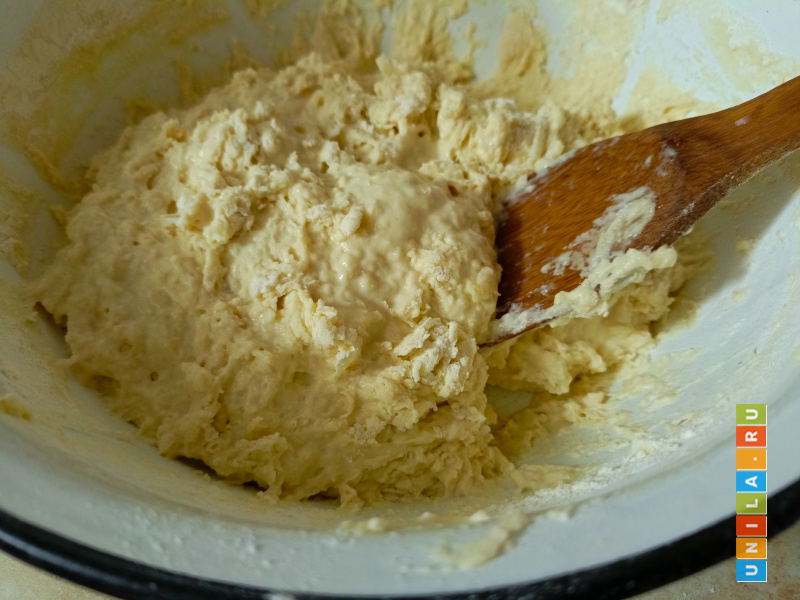 Всего нужно 850 грамм муки. Когда добавите всю муку, хорошо перемесите тесто и соберите в комок