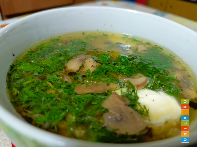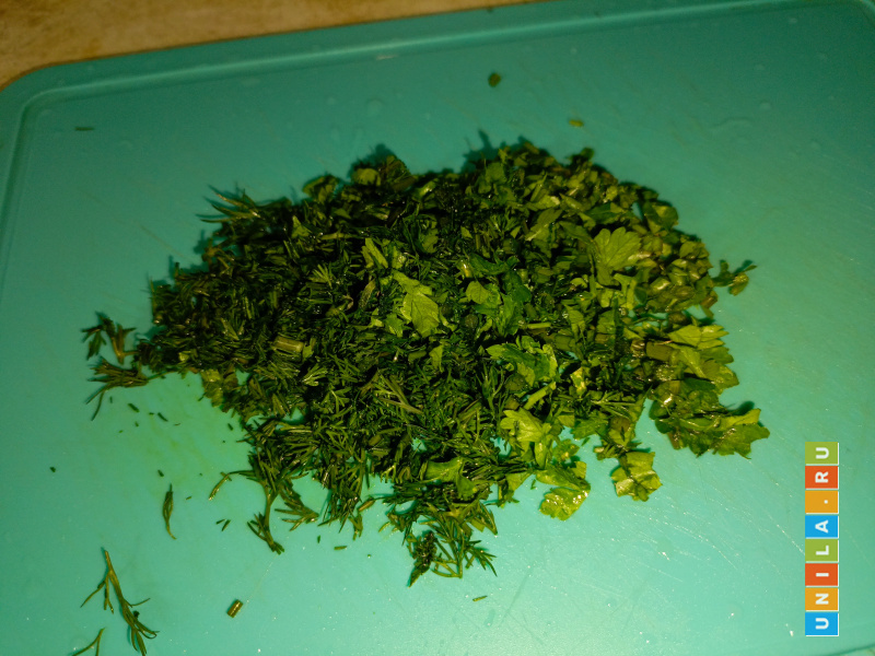 В самом конце за пять минут до готовности добавляем нарезанную зелень. Или кладём свежую зелень непосредственно в тарелки, посыпая ею суп