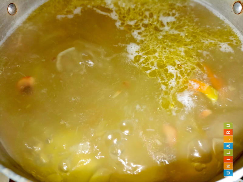 Когда вода с картофелем начинает закипать, выкладываем в кастрюлю грибы с луком и перцем. Добавляем специи и соль по вкусу, варим до готовности картофеля