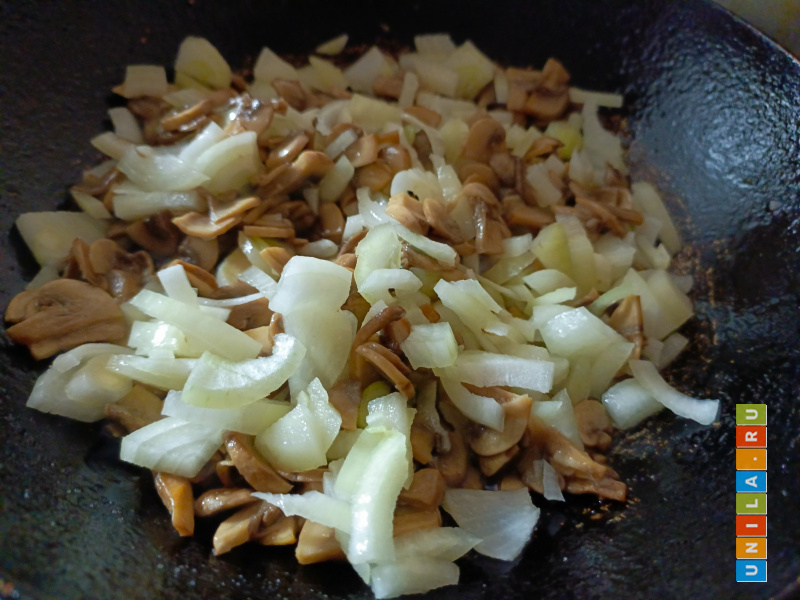 Когда грибы начали жариться в масле без воды добавляем нарезанный лук. Одну большую луковицу