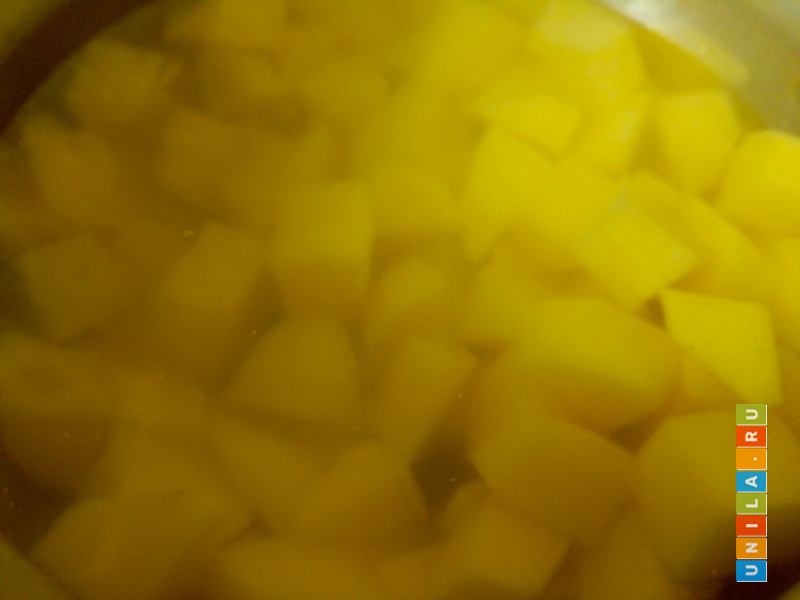 500 гр нарезанного картофеля залить двумя литрами воды, добавить 1 ч.л. соли и поставить кастрюлю на средний огонь