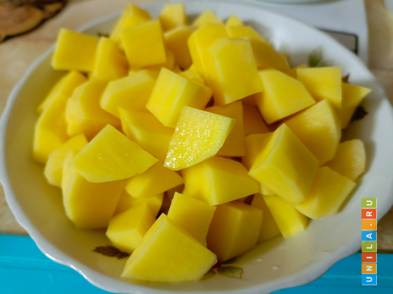 Нарезать картофель. Я режу небольшими кубиками примерно по три сантиметра