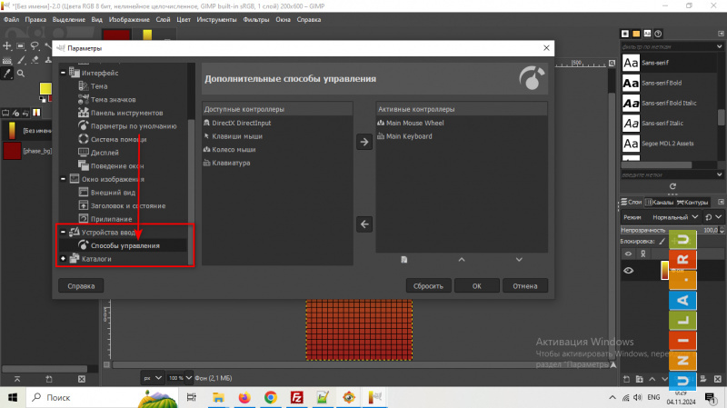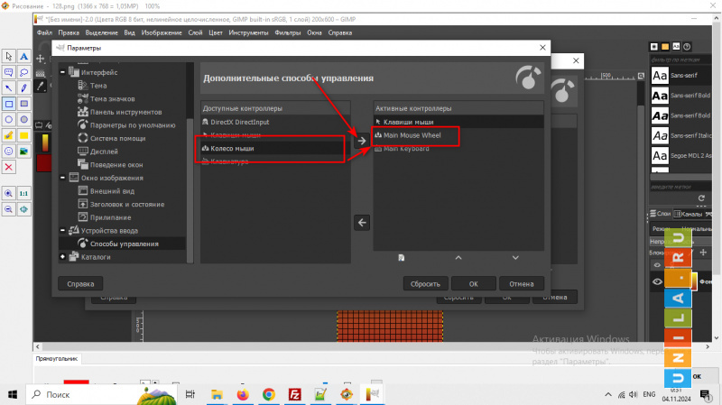 Выделить пункт Колесо Мыши и нажать стрелку Вправо, чтобы добавить колесо мыши в список активных контроллеров справа