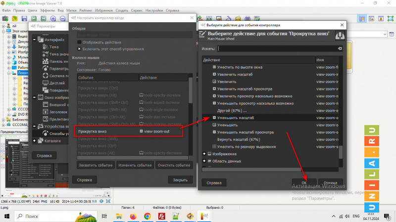Потом найти в левом окне пункт Прокрутка Вниз, двойной щелчок и в новом окне выбрать пункт Уменьшить Масштаб и нажать ОК