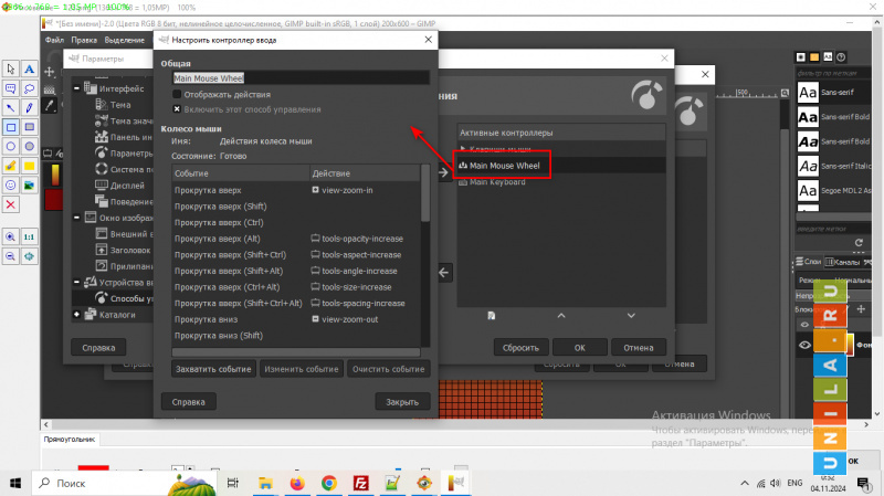 Сделать двойной щелчок правой кнопкой мышки по пункту Main Mouse Wheel или Колесо Мыши в списке контроллеров, показанном на скриншоте справа, чтобы открылось окно настроек, показанное на скриншоте слева