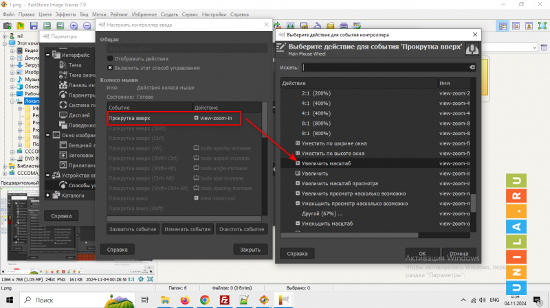 Найти пункт Прокрутка Вверх и кликнуть по нему дважды, чтобы открылось окно с опциями как на скриншоте справа, выбрать пункт Увеличить масштаб и нажать ОК