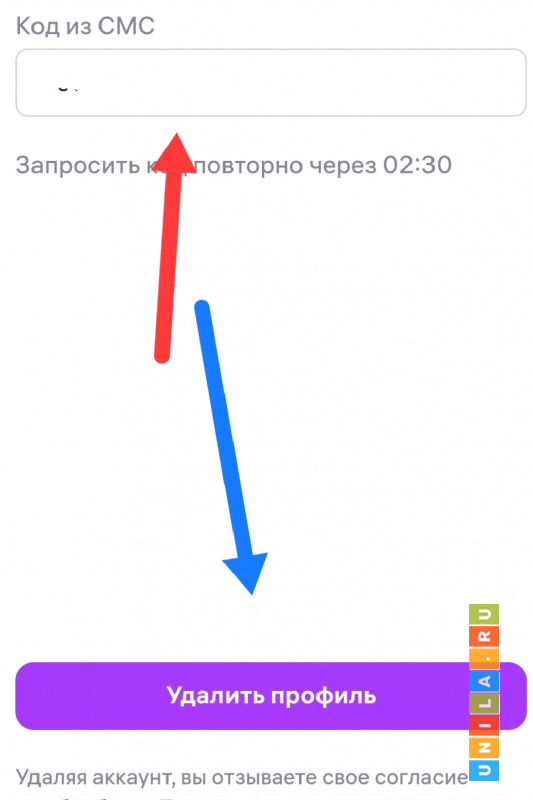 Введите код, который пришел в смс и нажмите кнопку для завершения. Аккаунт будет удален и вас перенаправит на главную страницу магазина