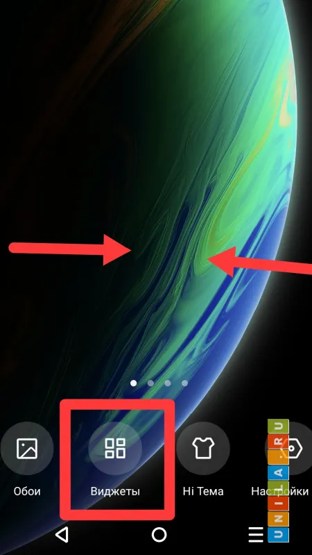 Обычно, чтобы вызвать кнопку виджетов нужно на пустом экране поставить два пальца на расстоянии друг от друга и свести по направлению друг к другу. Как показано стрелками. Внизу появилось меню. Откройте «виджеты»