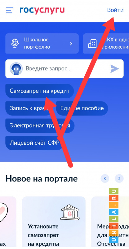 Открываем сайт Госуслуги, выполняем вход и нажимаем на ссылку «самозапрет на кредиты»