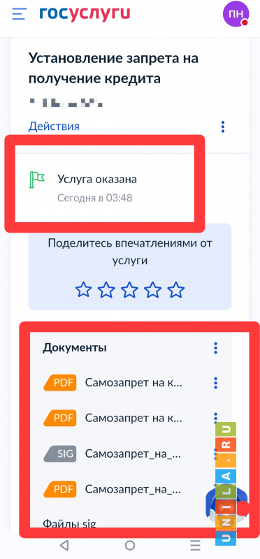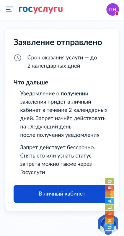 Уже через пять минут пришло уведомление о том, что сведения о запрете направлены в бюро кредитных историй и сохранены там