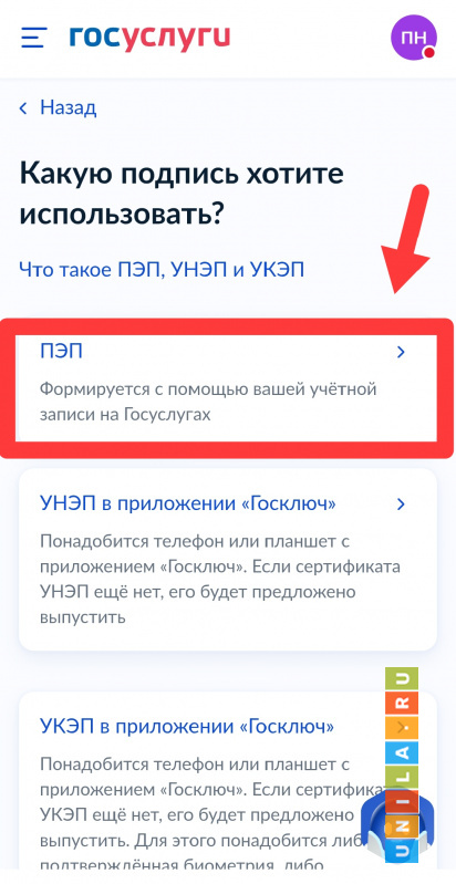 Выбираем способ подписания заявки. Я выбрал ПЭП. Это Простая Электронная Подпись через Госуслуги. То есть достаточно будет просто нажать на кнопку на следующем шаге