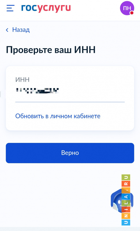 Сверяем свои паспортные данные и ИНН, подтверждаем, если всё правильно