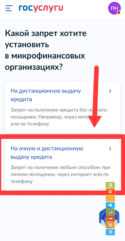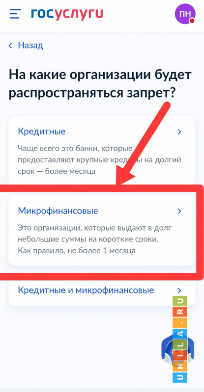 Уточняю тип запрета и выбираю «Микрофинансы»