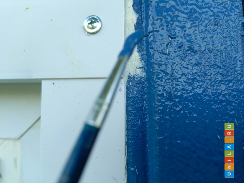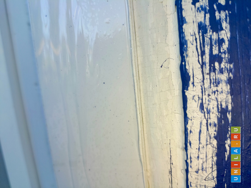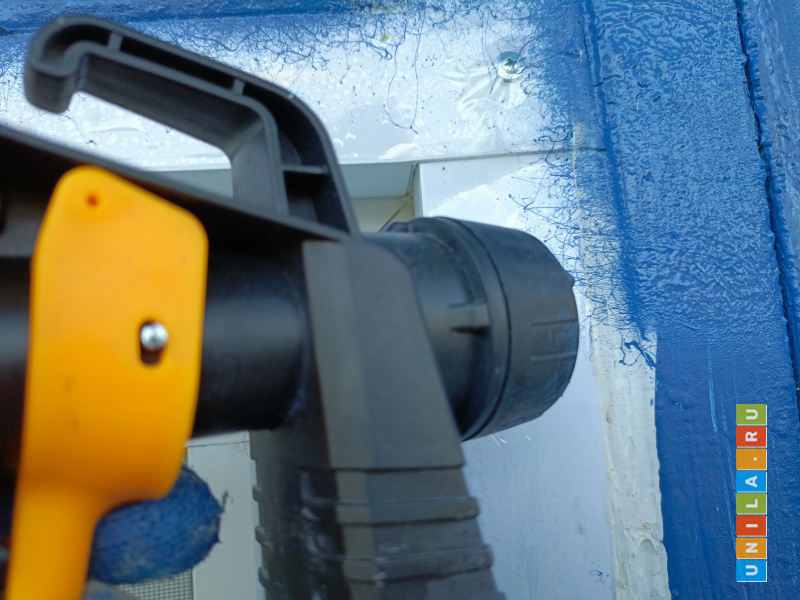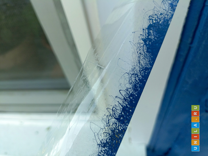 Держим краскопульт или водим кистью так, чтобы краска не могла попасть в щели между скотчем и окном, если они есть, и краска попадала на скотч не более чем на половину. В данном случае краскопульт под углом слева направо