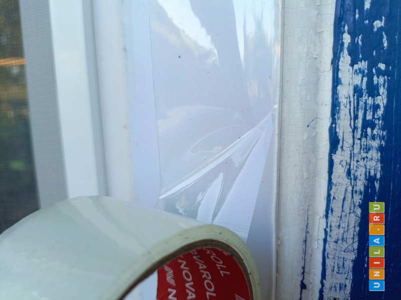 Широкий скотч наклейте на оконную коробку с той стороны откуда нужно покрасить, максимально выравнивая скотч по внешнему краю