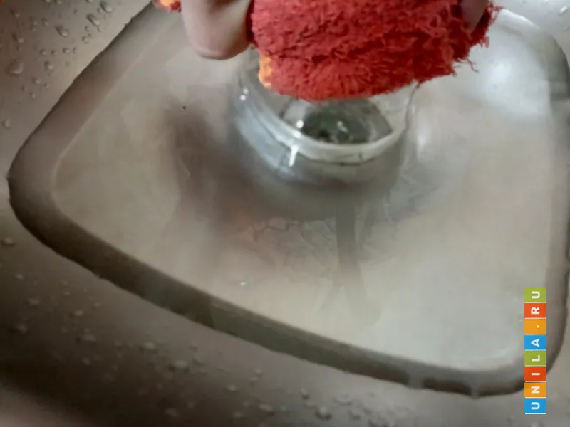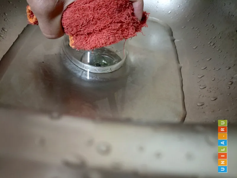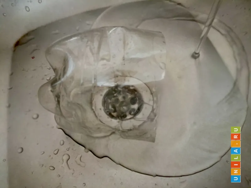 На кухне забился слив в раковине. В сложных, запущенных случаях нужно разбирать и чистить сифон под раковиной. В тех случаях, когда затор небольшой или как временное решение проблемы я использую для прочистки баночку из под сметаны, из под майонеза или пластиковую бутылку из под минеральной воды. Действовать нужно решительно, но осторожно, чтобы не сломать пластик и не пораниться им. Для защиты можно надеть перчатку или использовать тряпку.