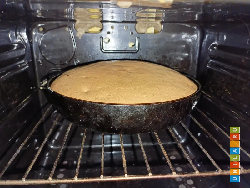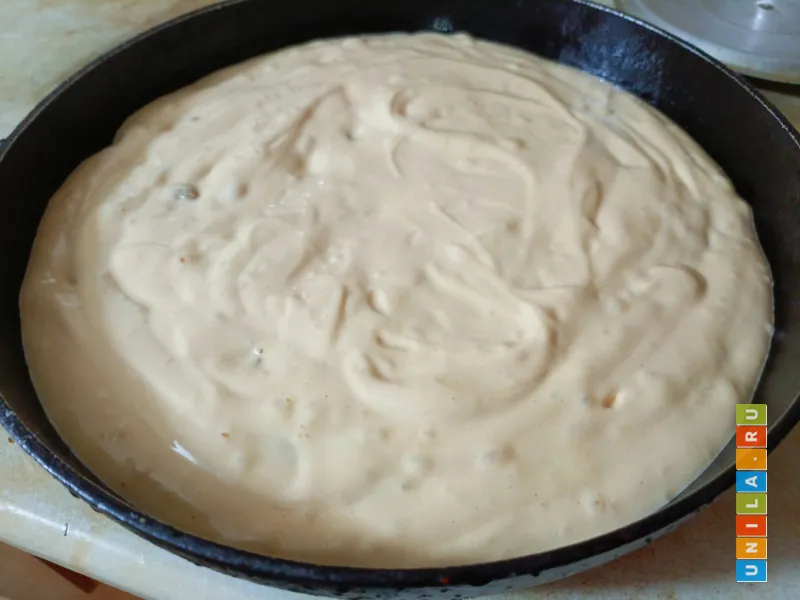 Вылейте тесто в форму. Оно должно заполнять её на 2/3. У меня сковорода среднего размера и объем теста как раз соответствует