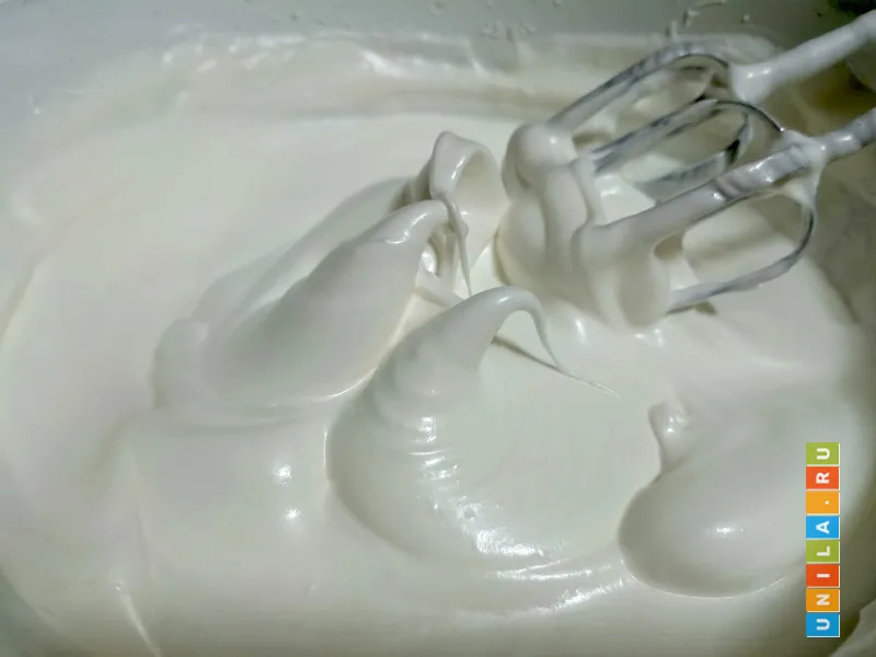 Возьмите 210 сахара и постепенно добавляйте его в белки, продолжая взбивать. Взбивайте белки и сахар до такого состояния как на фото