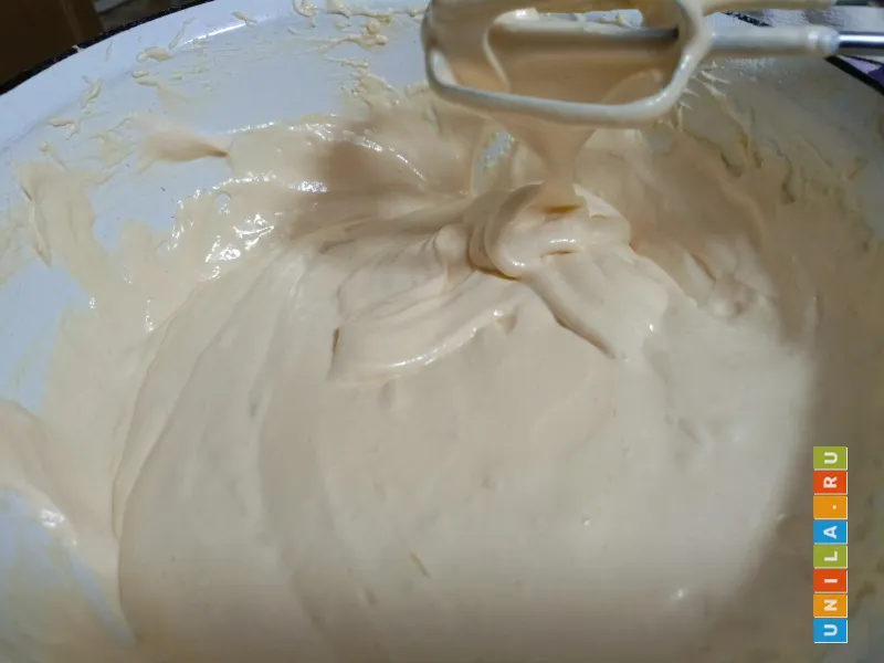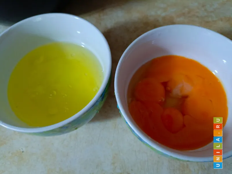 Перемешайте желтки и вылейте их в чашу с белками. Немного перемешайте, но долго взбивать не нужно