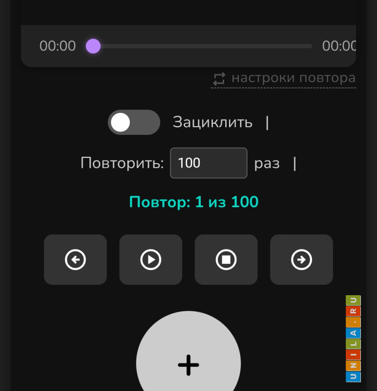 Если нужно повторять аудиозапись определенное количество раз или постоянно, пока не нажмёте на «стоп», можно воспользоваться онлайн приложением «Плеер» на данном сайте, где есть нужные функции. Устанавливать плеер не обязательно, просто откройте страницу https://unila.ru/apps/2158
