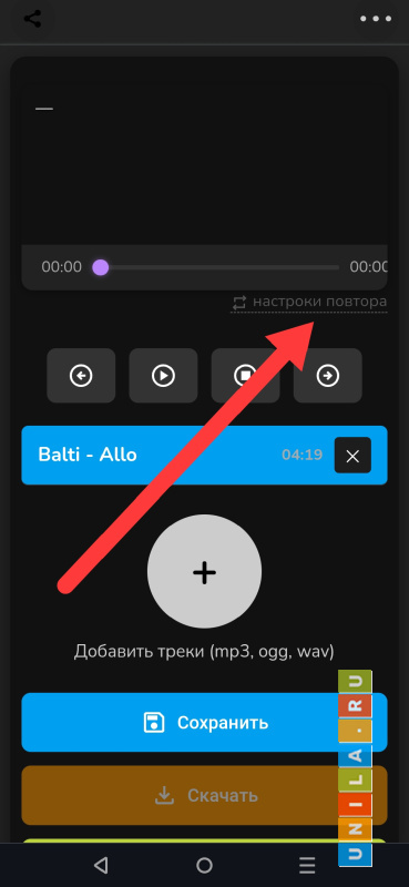 Укажите количество повторов (красная стрелка) или сдвиньте переключатель «зациклить» вправо для бесконечных повторов (синяя стрелка)