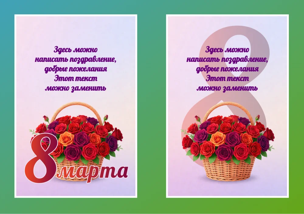 Просто выберите один из вариантов шаблона. Все они подходят для открытки с женским днём 8 марта.